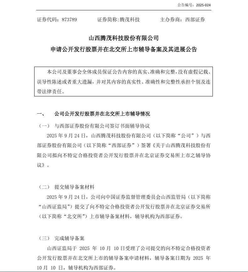 公告显示,山西证监局于2025年10月10日受理了公司提交的向不特定合格投资者公开发行股票并在北交所上市的辅导备案申请材料,辅导备案日期为 2025年10月10 日,辅导机构为西部证券。